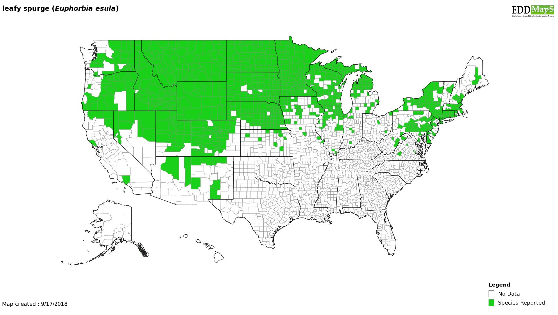 Leafy Spurge (Euphorbia esula) is a yellowish-green, flowering perennial which is considered to be an invasive noxious weed in horse pastures worldwide. The plant is of the Euphorbiaceae (spurge) family, which are known for containing a milky sap within their stems and leaves. This sap contains diterpene esters, which are skin and gastrointestinal tract irritants. The sap remains toxic in fresh or dried plants.